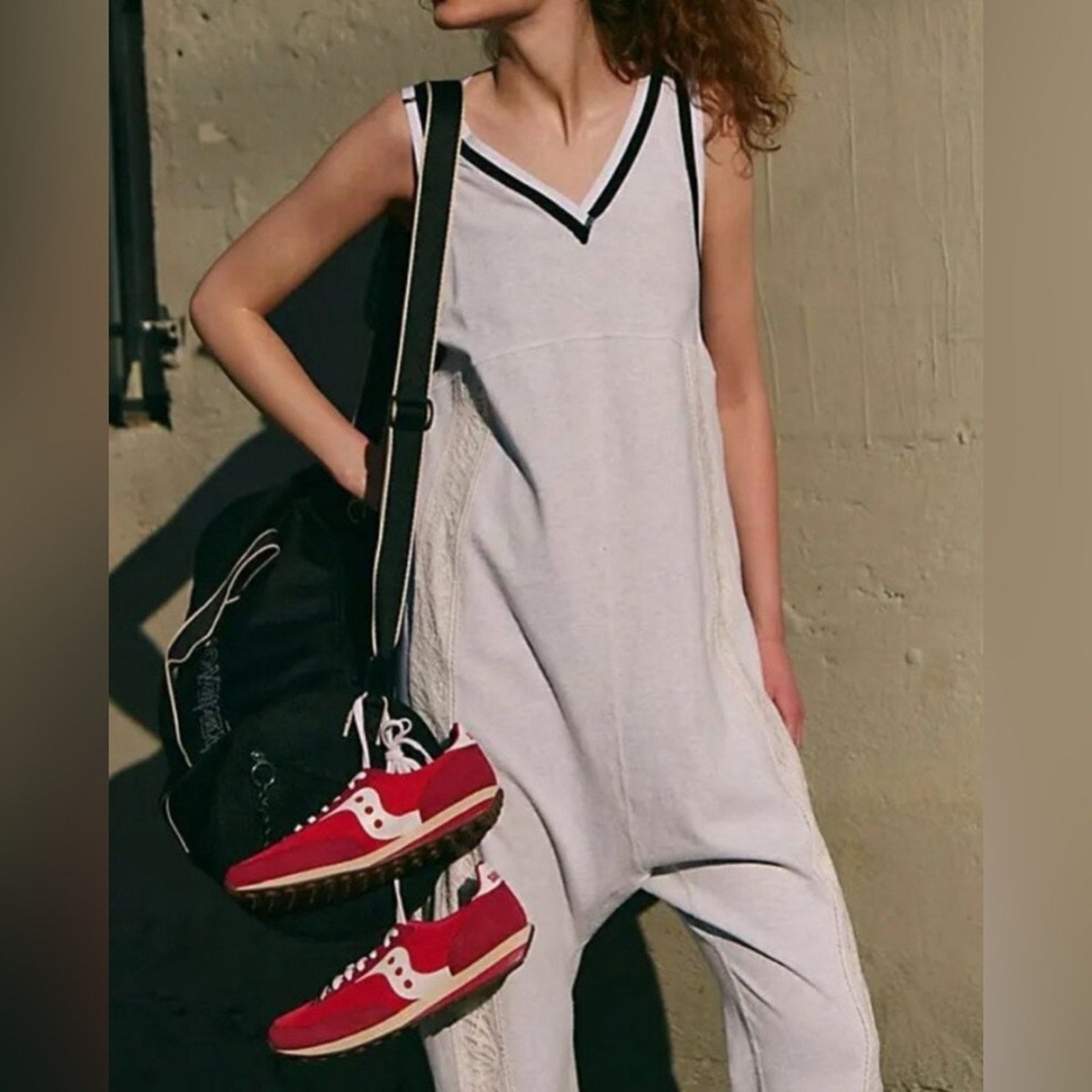 Just as effortless as it is essential, this wear-anywhere onesie is featured in a slouchy, relaxed fit with V-neckline, cutout at back, lace detailing, and striping at sides for an added sporty touch, Relaxed, slouchy fit, V-neckline; dropped armholes; cutout back; tapered legs; lace and stripe detailing. Lovely for layering up over a long sleeve or solo over a sports bra for the most effortless to-and-from style.