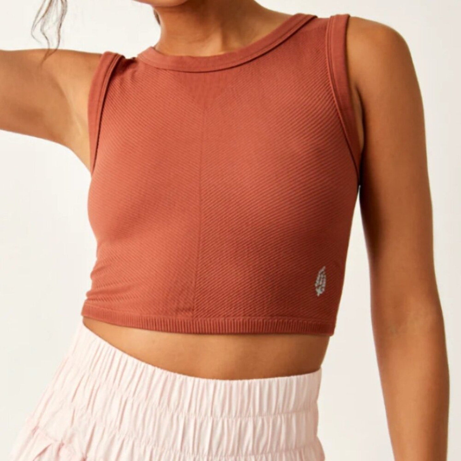 A new addition to your favorite compressive collection, this sleek tank is featured in a cropped fit and muscle-style silhouette with ribbed knit detailing and slight scoop neckline. Cropped, pull-on style, Stretchy, ribbed knit fabrication; compressive feel, scoop neckline, muscle silhouette, sleeveless design. This essential tank can be worn on its own or layered up over your favorite bra for a more supportive feel.