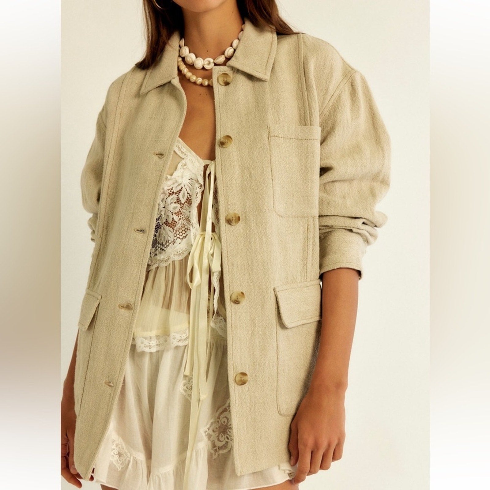 A breezy fabrication meets a staple outerwear style with this cotton-linen chore coat. Relaxed, longline, Cotton-linen fabrication, collared neckline, button-front closure, flap pockets, patch chest pocket, drop-shoulder sleeves, button cuffs. A light layer for temperate spring days. relaxed linen jacket Free People casual linen outerwear Free People spring linen jacket