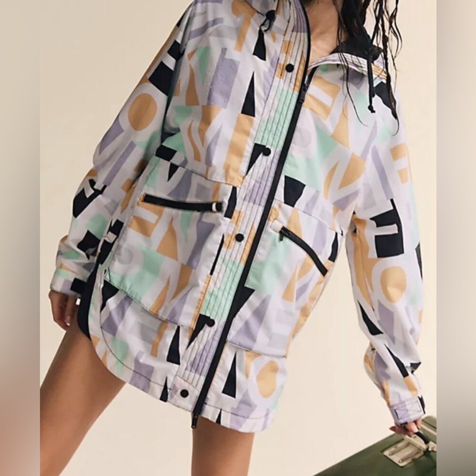 Your favorite rainy-day essential now featured in a playful printed fabrication and the same packable design you know and love. Oversized, relaxed fit; longer length, Breathable fabrication, sweat-wicking interior mesh lining. Waterproof and wind-resistant, printed design allover, fully seam-sealed, packs into pocket at the back, back pocket also serves as a storage pocket, when jacket is packed the bag can be worn as a sling, adjustable bungee cord at hood, bellow pockets and hand pockets with waterproof zipper, adjustable hook-and-loop closures at sleeve cuffs.