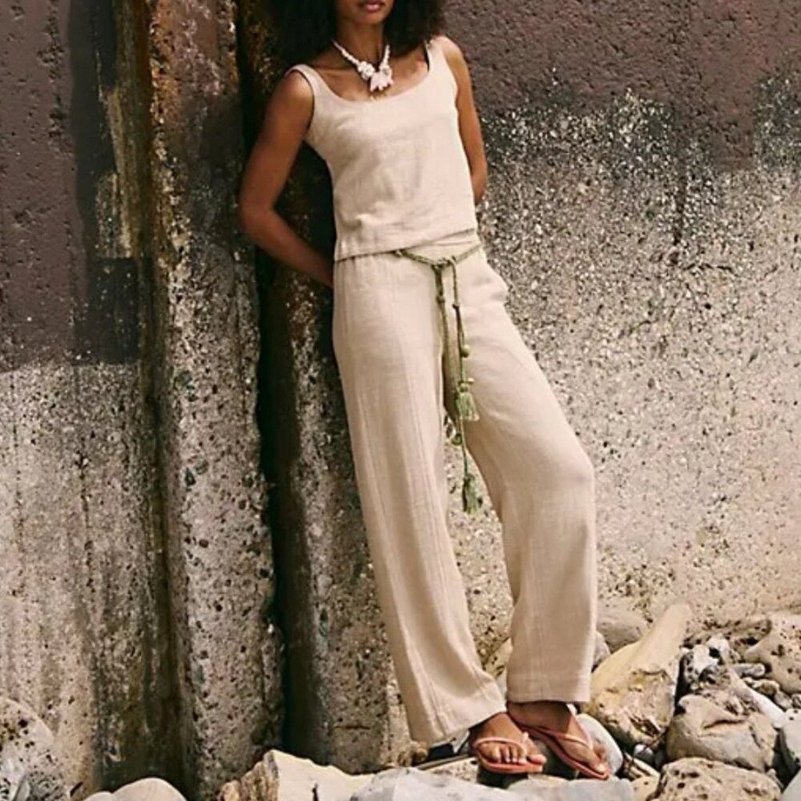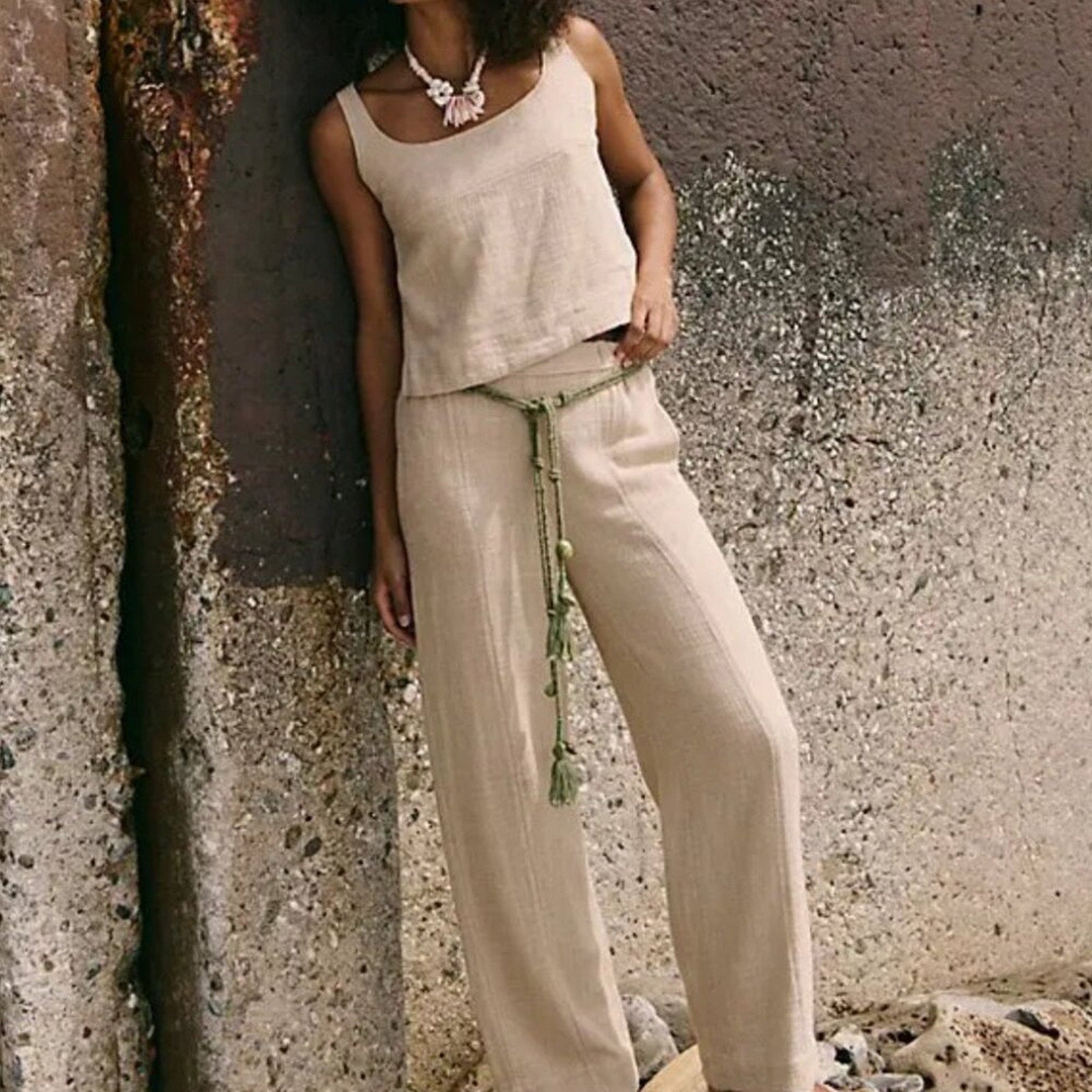 Minimalist with a daring twist; this simple set from free-est features a backless tank and relaxed pull-on pants in a textured cotton fabrication for easy, breezy outfitting.