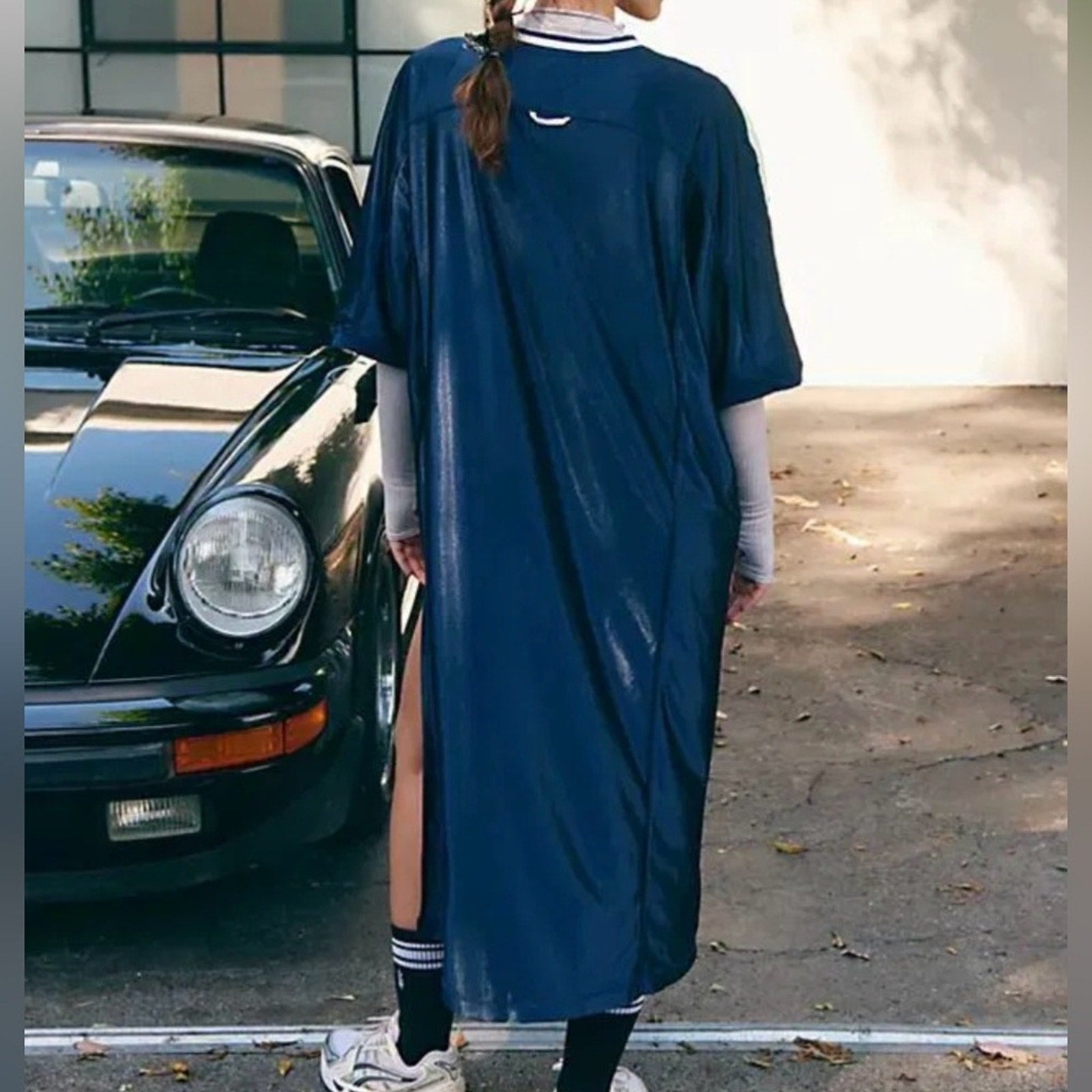 Dramatic and lightweight, this extra-long tee is a must-have in your to-from wardrobe. Featuring a sleek fabrication with subtle shine and classic jersey-inspired details. Relaxed fit; long silhouette hits below knee, Lightweight; breathable; subtle shine; short sleeve hits at elbow; bottom hem hits below knee; side seam slit; jersey collar and number detail; v-neck. A stand out and must-have.