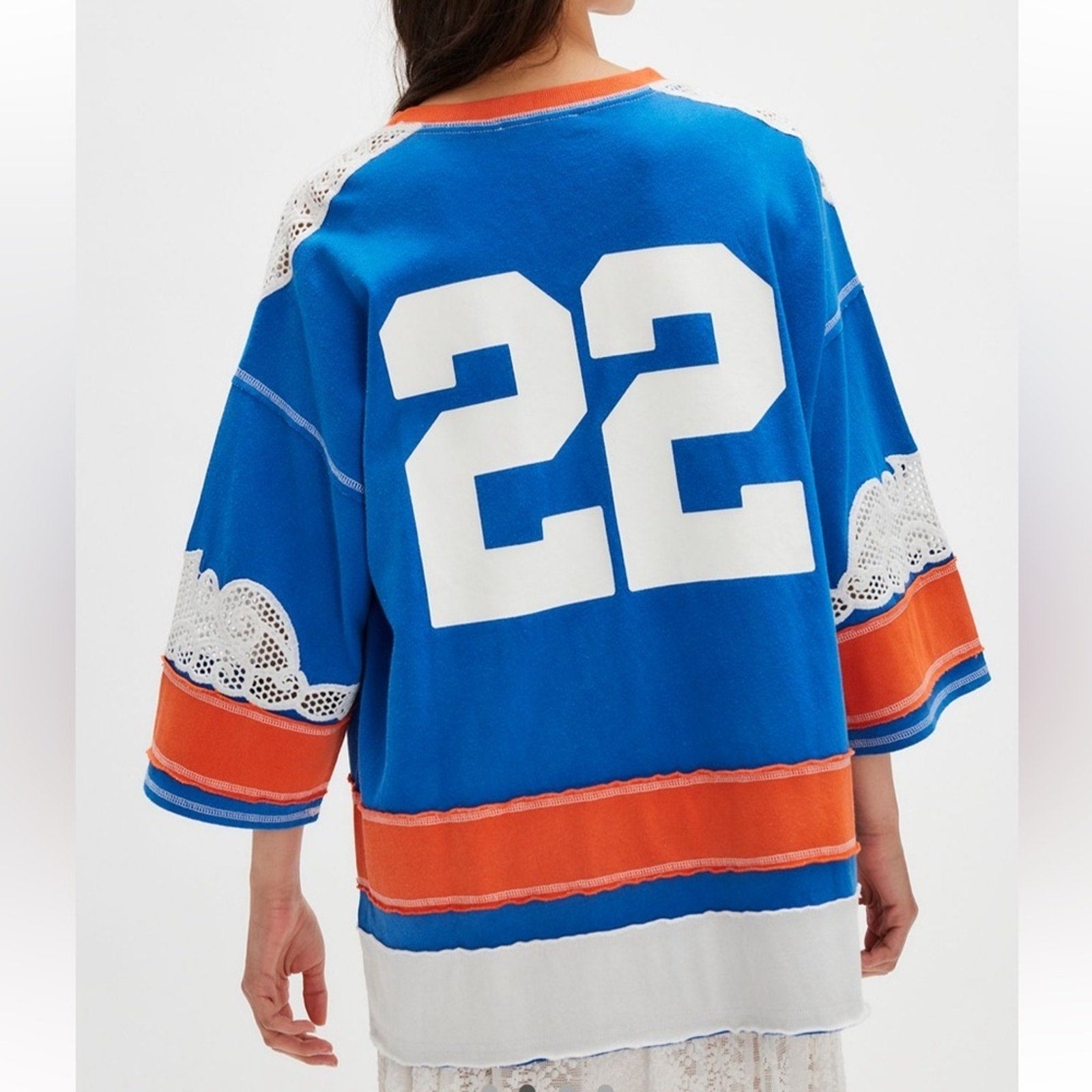 Relaxed, oversized, Thick jersey fabrication, wide, drop-shoulder ¾ length sleeves, V-neckline, contrast seams, sporty graphics, lace inlays. Pair with a maxi skirt and terrace sneakers for a cool, comfy look.